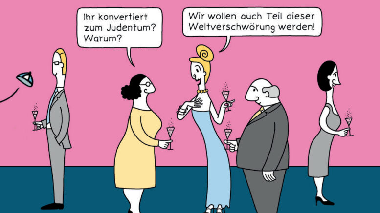 In der Ausstellung werden Cartoons und Texte präsentiert, die überspitzt und ironisierend der Gesellschaft einen Spiegel vorhalten, indem sie bestehende Ausgrenzungen, Abwertungen und Vorurteile ins Lächerliche ziehen. Unter dem Brennglas des Humors entsteht so eine Momentaufnahme des heutigen Antisemitismus. Das Material stammt aus der Cartoon-Anthologie „Antisemitismus für Anfänger“ des Ariella Verlags.