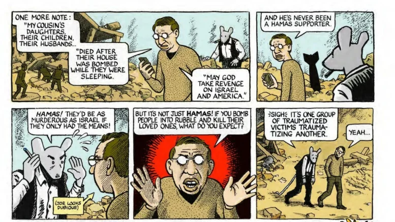 „‚Never again! … and again … and again‘: Ein Dialog über den Nahostkonflikt in Comicform, entstanden aus der Zusammenarbeit zwischen den beiden Comiclegenden Joe Sacco und Art Spiegelman. Die beiden Hauptfiguren unterhalten sich in den Trümmern von Gaza, blicken zurück auf den 7. Oktober und die unverhältnismäßige Reaktion Netanjahus.“