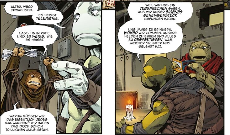 Dabei werden Fragen wie die Verantwortung des Schöpfers (unangenehm, wenn ausgerechnet die künstliche Intelligenz den Finger in die Frankenstein-Wunde legt) ebenso berührt wie die gefühlte Heimatlosigkeit der Turtles, die ebenso zwischen einem Selbstbild als Held oder Monster schwanken, wie dies schon ein gewisser Ben Grimm tat. Neben dem typischen Superhelden-Duktus (vor allem Casey Marie kommt im violettem Kostüm rüber wie eine waschechte Version der Huntress aus der Bat-Familie) mit Panzer (Batmobil) und Tunneln (Bathöhle) erlaubt man sich in der Feder von Ben Bishop, Esau Escorza und Isaac Escorza auch einige stilistische Hommagen, so etwa im Rückblick auf die Entstehung der ersten Turtles, der im undergroundigen Stil der ursprünglichen Hefte gehalten ist. Somit ein weiterer beeindruckender Beitrag zu Eastmans „Ronin-Verse“, der bei Splitter im Hardcover erscheint und die komplette Mini-Serie „The Last Ronin: Re-Evolution“ enthält.