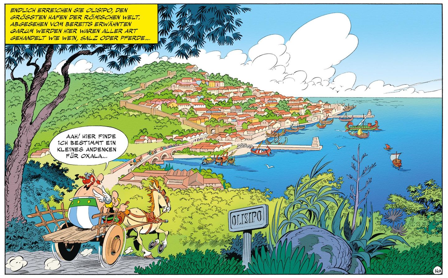 Neben diesem Erzählschema (das Dorf als uneinnehmbare Festung) – vielfach variiert in Comic, Film und nun eben auch in Serie – gibt noch ein zweites Schema, das die Entgegensetzung von Galliern und Römern auf eine ganz andere Weise inszeniert: Im neuen, ebenfalls im vergangenen Jahr erschienenen Comicband „Asterix in Lusitanien“ von Fabcaro und Conrad eilen Asterix und Obelix einem lusitanischen Garum-Produzenten zu Hilfe, der verdächtigt wird, einen Giftanschlag auf Cäsar geplant zu haben. Schließlich kommen die beiden Gallier, die sich als schwarzhaarige Einheimische frisieren und verkleiden, einem Komplott des römischen Präfekten Fetterbonus auf die Schliche und können die Unschuld des zuvor schwer belasteten Schãoprozes beweisen. Die Geschichte ist voller augenzwinkernder und liebevoller Anspielungen auf die lusitanische bzw. portugiesische Kultur und Geschichte sowie weiterer Referenzen auf politische Persönlichkeiten und Ereignisse der jüngeren Gegenwart. Doch ist es vielleicht etwas zu weit hergeholt, die Tatsache, dass man bis zur ersten epischen Schlägerei der beiden gallischen Freunde mit einer römischen Legion erst bis zur Mitte des Albums vordringen muss, als Anspielung auf die gewaltfrei verlaufene „Nelkenrevolution“ zu lesen, die 1974 die rechtsgerichtete Salazar-Diktatur stürzte? Es wird zumindest die nicht letzte handfeste Auseinandersetzung gewesen sein, soviel sei versprochen.