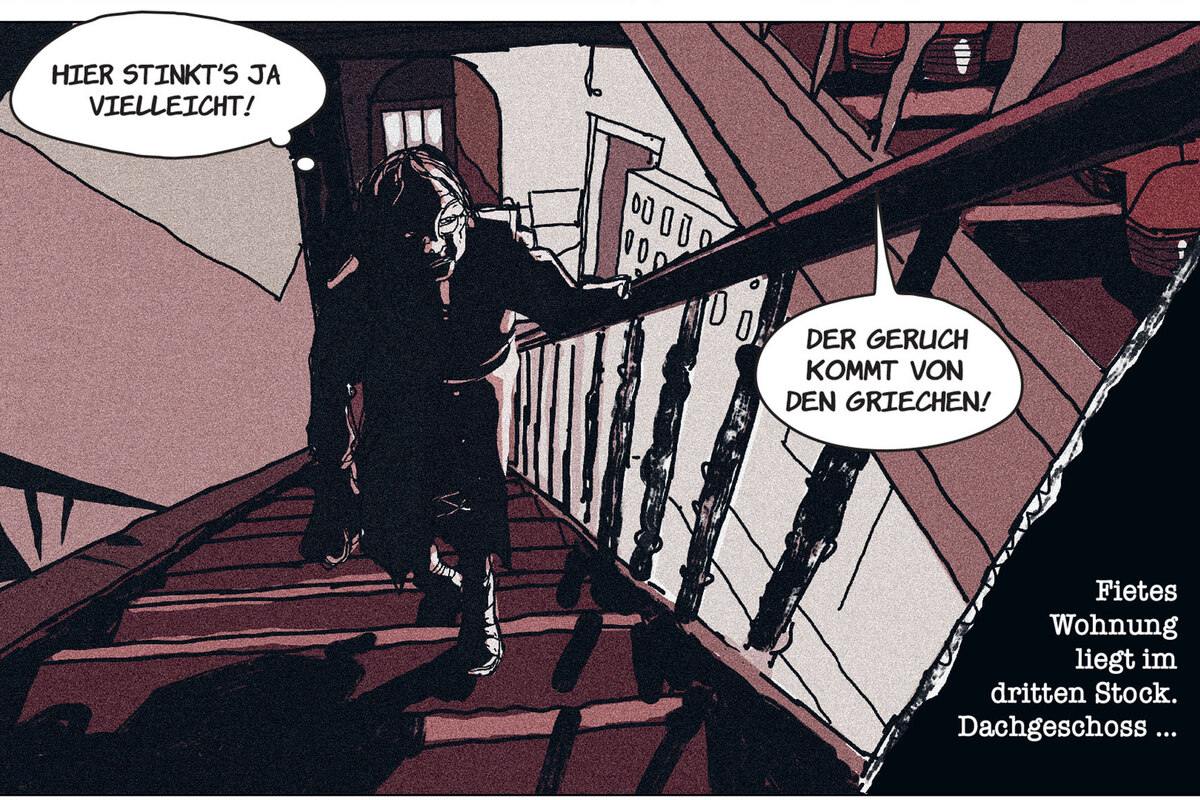 Strunk hatte Arndt freie Hand gelassen, nachdem der ihn vor neun Jahren mit Probezeichnungen aufgesucht hatte. Entstanden ist eine eigene Interpretation des Stoffs, mal kompakter, mal verharrend, mit ausgewählten Text-Zitaten, aber auch um neue Handlungsstränge erweitert, die Arndt hineinflicht. Sie unterstreichen geschichtliche Zusammenhänge. Gleich im Bucheinband hilft der Abdruck eines alten Stadtplans, den Handlungsraum zu verorten, wie er zu Beginn der 70er Jahre war. Dann steigen wir hinab ins nächtliche Rotlichtmilieu, in die Kaschemme „Der goldene Handschuh“ in der Talstraße im Hamburger Stadtteil Sankt Pauli.