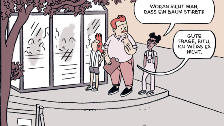 „Baumschatten“ heißt der Comic, und damit ist vor allem der Schatten der Vergangenheit gemeint, der auf dem Schulbaum liegt. Die Liebe zum bedrohten Baum wird deutlich getrübt, als das sogenannte Antifaschistische Baumkollektiv auf den Plan tritt. Denn auf dem Schulhof steht eine Hitler-Eiche, so hat es das Baumkollektiv recherchiert. Eichen galten als Symbol für das Deutsche und Beständigkeit, sie wurden als Denkmal für den Nationalsozialismus gepflanzt. Das Baumkollektiv verlangt, dass die Schule eine Erklärung zur Eiche abgibt. Die Schulleiterin Frau Tröwe will den Baum allerdings möglichst stillschweigend fällen, weil ihr Großvater, ein glühender Nationalsozialist, sie gepflanzt hat. Das birgt schon genug Konfliktstoff – weil alle in einem Kiez unterwegs sind, begegnen sie sich auch noch ständig. Der Gründer des Antifaschistischen Baumkollektivs ist ausgerechnet jener Kamil, mit dem Sjonnie eine ausschweifende Affäre hatte. Und weil die Schulleiterin Tröwe einen Fake-Account bei der Dating-App hat, mischt die auch noch mit. Status: „Es ist kompliziert.“