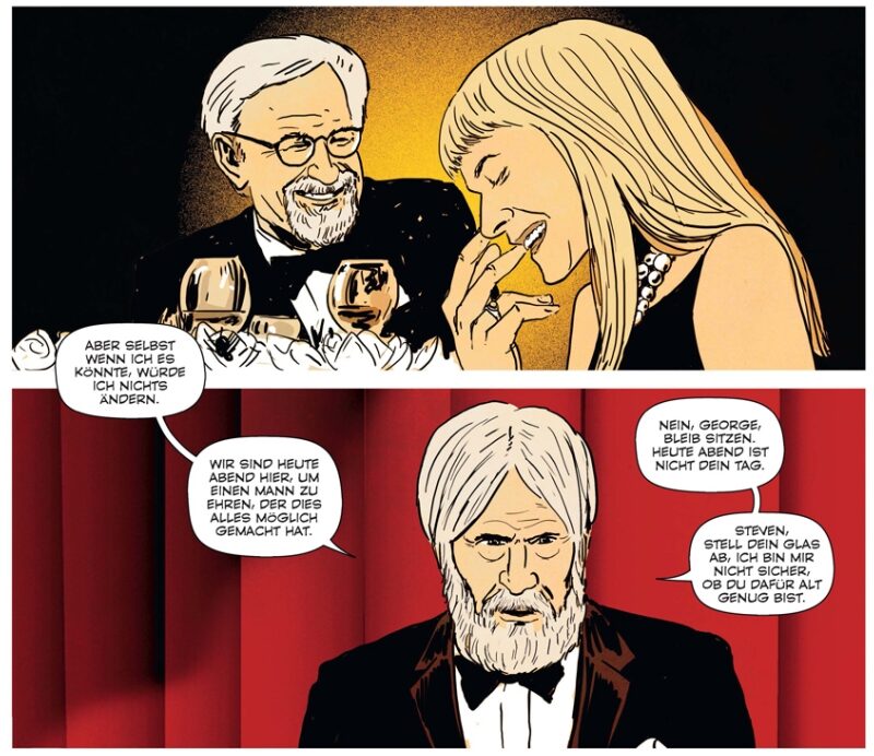 Die mangelnde Vertiefung und fehlende thematische Konzentration sowie der plakative Look des biographischen Comics lassen den zwischen „großem Kind“, erfolgsverwöhntem Regisseur und politischem Filmemacher oszillierenden Spielberg merkwürdig blass erscheinen. Dabei gäbe es immer mal wieder Anlässe zum Innehalten. Ein paar mehr Seiten widmet Amazing Ameziane – in diesem Fall dezidiert in Schwarzweiß – zumindest „Schindlers Liste“, den Steven Spielberg als „persönlichster Film und prägendste Erfahrung meines Lebens“ bezeichnet. Wie weitreichend seine Betroffenheit und Beschäftigung diesbezüglich reichen, mag ein Zitat veranschaulichen, das dem Kapitel vorangestellt ist und das gerade angesichts gegenwärtiger politischer Verwerfung durch einen erstarkenden Rechtsnationalismus leider nach wie vor aktuell ist: „Die Tragödie besteht für mich vor allem darin, dass wir nicht das Geringste aus dem Holocaust gelernt haben.“